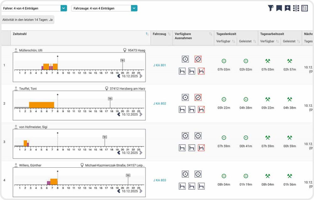| Keine Auswertung über Lenkzeiten, Ruhezeiten und Sozialverstöße | Echtzeit-Übersicht für Disposition & Fuhrparkmanagement |
