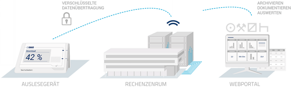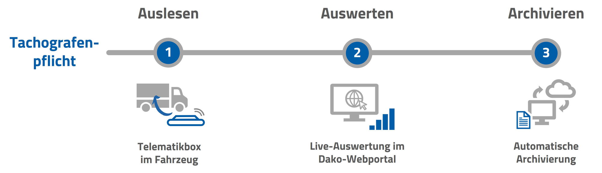 Die Fahrerkarten- und Tachografendaten werden automatisch erfasst, verschlüsselt übertragen und revisionssicher archiviert.
