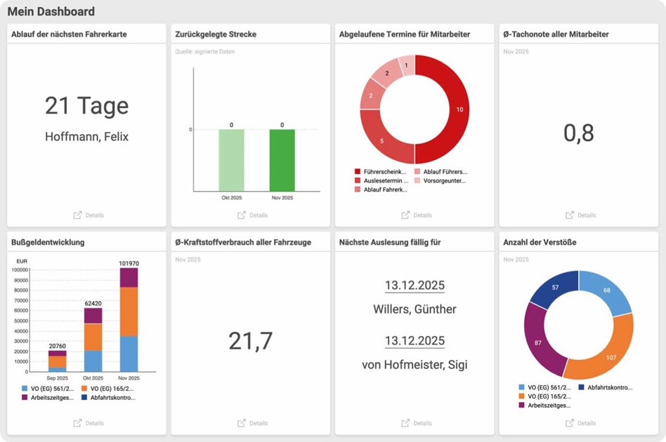 Wichtige Informationen wie das Ablaufdatum der nächsten Fahrerkarte, zurückgelegte Strecken oder der Kraftstoffverbrauch Ihrer gesamten Fahrzeugflotte lassen sich einfach und schnell per Klick abrufen und auswerten.